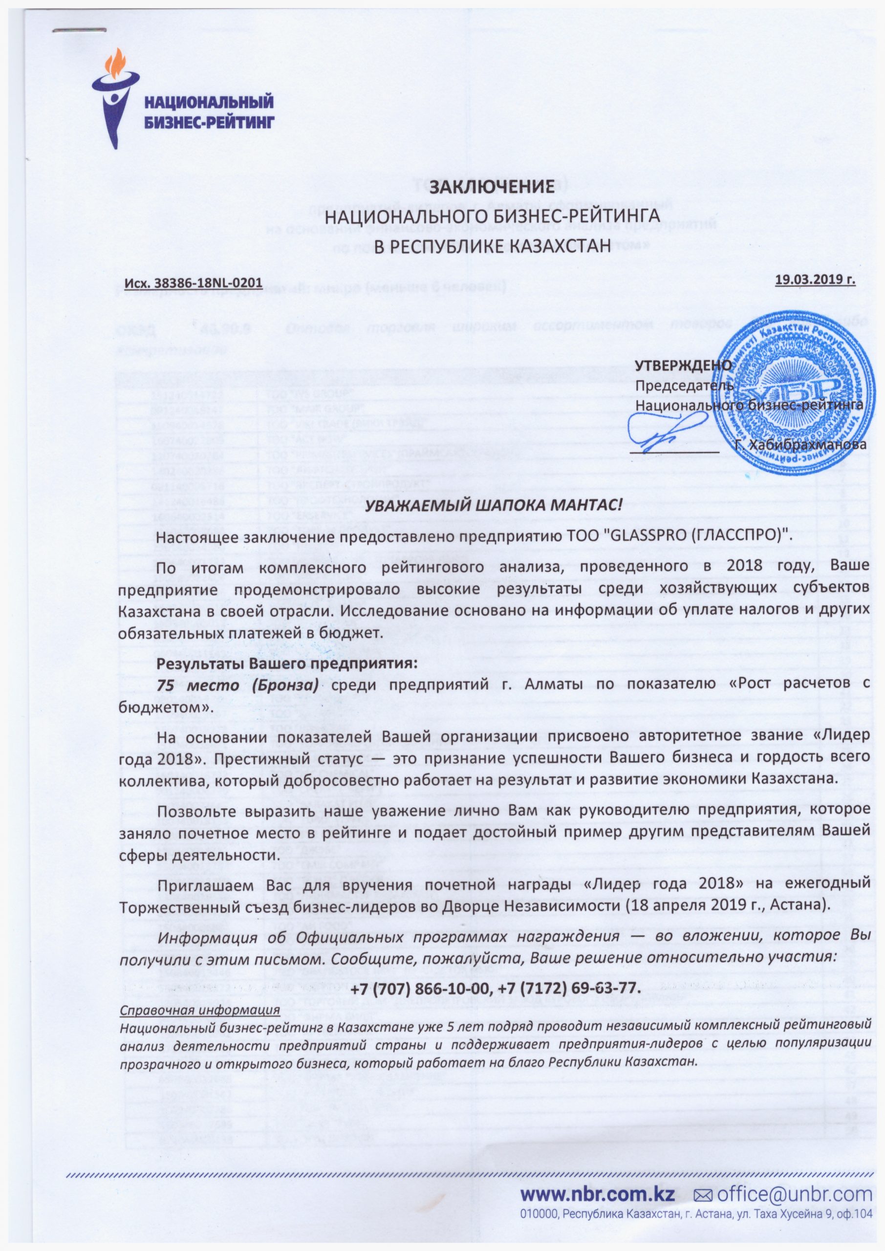 Оргкомитет Национального бизнес-рейтинга в Казахстане вручил заключение об экономическом рейтинге предприятия.